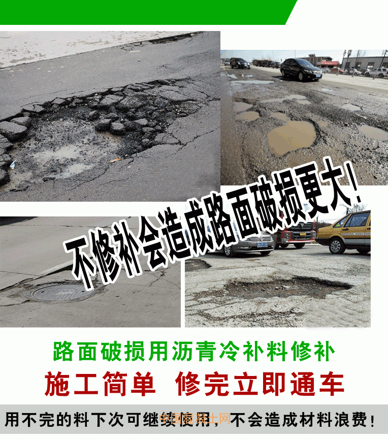 修補質量佳:冷補料具有極強的抗老化和粘結性能,修補后的坑穴,不易產生脫落、龜裂等不良現象,不需重復修補。