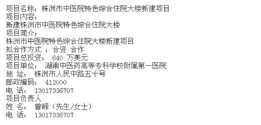 湖南株洲市中醫(yī)院特色綜合住院大樓新建項(xiàng)目招商引資