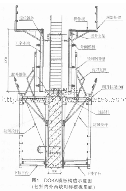 正常使用時, DOKA模板支撐系統通過爬升錐懸掛在已澆筑好的混凝土壁外側, 上層面板系統用來澆筑新層, 同時在新層位預埋定位錐, 待混凝土強度達到要求后, 改定位錐為爬升錐, 然后提升模板, 將支撐系統懸掛在新的爬升錐上, 以此類推, 逐層施工。