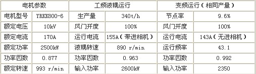 和德三獅水泥5000t/d高溫風機電機及變頻改造前后運行參數(shù)列表: