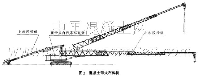 自行帶式混凝土布料機(又稱胎帶機),是將帶式輸送機與大型機動自行底盤結合的一種新型的混凝土澆筑和物料輸送新設備。該設備可360°回轉,在一定范圍內伸縮自如,機動、靈活,生產效率高。它與市政建設常用的混凝土泵桿布料機(混凝土泵+ 布料桿)不同,帶式布料機不受混凝土級配限制,可輸送常態混凝土,也可輸送干硬性混凝土如RCC 和顆粒性物料,是混凝土澆筑和物料輸送的革命性施工設備。我國在1997 年引進美國ROTEC 公司的胎帶機(輪胎式吊車底盤與布料膠帶機組合)、塔帶機(塔機與布料膠帶機組合)應用于三峽工程,實踐證明是一種生產效率高、經濟實用的混凝土施工設備。