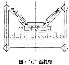 2.4 懸掛式柔性“U”型托輥和“V”自定心托輥為避免骨料分離,減少膠帶振動,保證膠帶穩定運行,布料機專利采用獨特的懸掛式柔性“U”型托輥(圖4),膠帶運行平順、抗震性好、拆裝方便?!癠”型托輥的側輥與中間輥之間呈60°夾角,形成深槽,可很好的包容混凝土拌和物。在上料膠帶機鉸接處設計有三重“U” 型托輥,使膠帶能在桁架鉸接處平滑過渡;