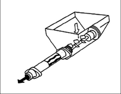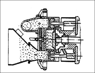是日本德斯古馬恩型濕噴機工作原理圖。該濕噴朵為豎立的兩個罐,上罐拌料,下罐噴射,上下罐均有密封閽門,交替開啟,關閉,以實現連續噴射。下罐底部有一橫臥螺旋驅動濕拌和料至料管內噴射出去。這種濕噴機的缺點 是上料高度大。比較笨重。