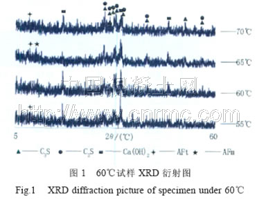 的不良影響, 需要進(jìn)一步研究。70℃試樣有AFt 衍射峰( 0.9847 nm) , 但并不明顯, 說明70℃混凝土試樣表面的裂紋及混凝土強(qiáng)度的降低可能并不是因?yàn)檠舆tAFt 引起, 而是由于溫度應(yīng)力引起內(nèi)部結(jié)構(gòu)破壞導(dǎo)致強(qiáng)度降低。