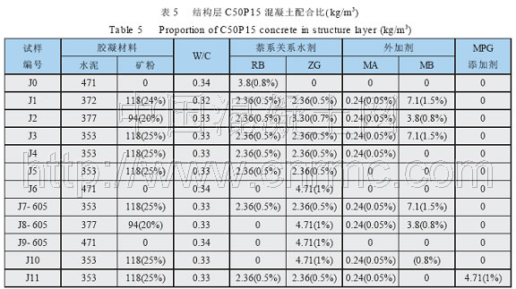 結(jié)構(gòu)層混凝土配合比及結(jié)果見表5、表6。