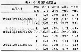 試驗得到3種尺寸試件的極限抗壓強度如表3所示。一層約束素混凝土方柱的極限抗壓強度與未約束素混凝土方柱相比極限抗壓強度都有所提高,但提高的幅度都不大,3種尺寸