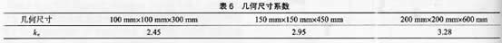利用本文的強度計算公式得到各約束混凝土構件的強度如表5所示。其中幾何尺寸系數取值如表6所示。由于考慮了尺寸效應的影響,所以修改后的強度模型值更接近于試驗結果。