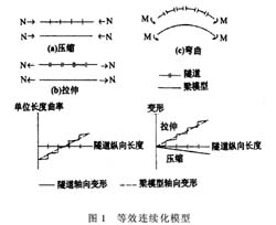 該模型是將管片環與接頭并不一一模型化,而是用縱向變形特性相似的一些梁單元來模擬隧道全長或某一區段的一種模型。