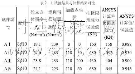 由于目前還未有人對外包鋼法加固異形柱做過試驗研究,還無法用ANSYS 計算的數據與試驗相比較。但我們可以先比較未加固異形柱有限元分析的準確性來得知ANSYS 分析異形截面的仿真程度。從前面幾點分析可知,有限元分析的異形柱破壞過程可以完全與試驗相吻合。下面來比較兩者的極限承載力。
