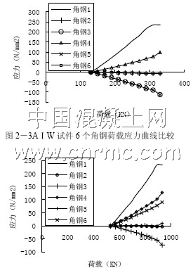 從以上這些角鋼荷載應力曲線圖可以看出,同一異形柱中的不同部位的角鋼應力都各不相同,這是偏心荷載和不規則的異形截面造成的。在同一柱子中,有的角鋼應力很大,有些角鋼應力偏小,有些角鋼應力甚至接近為零。這是因為有的角鋼離中和軸較遠,當異形柱二次受力時,這些離中和軸較遠位置的角鋼應變發展快,當異形柱破壞時,角鋼基本能夠達到屈服強度,充分發揮了角鋼的作用。有些角鋼離中和軸近,這些角鋼的應變發展較慢,最后角鋼只能發揮出部分強度。而有些角鋼恰好就處于中和軸上,如AⅠ構件中的角鋼2 和角鋼6,直至異形柱破壞時,角鋼應力仍接近零,這些角鋼在異形柱加固中只發揮了少量作用。