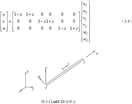 1、分離式鋼筋采用Link8 三維桿單元進行模擬,Link8 為可以承受單軸拉壓應力的三維空間桿單元。可以實現鋼筋的彈塑性階段分析。此單元為兩節點線單元,每個節點具有X、Y、Z 三個方向的節點位移u、v、w,如圖所示,以線單元的中點作為單元局部坐標原點,建立關于以沿單元長度方向離原點距離為s 的形函數:
