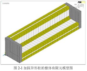混凝土加固異形柱有限元單元劃分尺寸,橫向為20mm×20mm,縱向為50mm,具體模型如圖2-1 在以后的說明中如無特別說明,皆采用圖中的坐標軸方向。在柱端部是墊板,異形柱的各個角部和凹槽部位是角鋼。