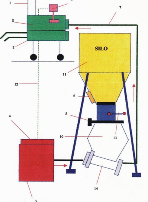 由輸送管(no.7)從筒倉底的接收罐(no.10)傳送到喂料罩(no.8)。控制線(no.12)連接喂料罩上的料位儀和傳送系統的主控制箱(no.4)。整個輸送系統受控于料位儀(no.9)完全自動化操作;