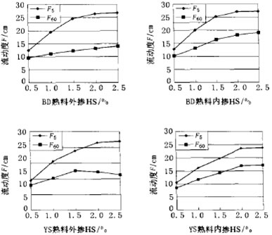 圖4是HS減水劑與2種熟料相容性的試驗結果,可見,HS外摻時,在相同的水灰比下雖然比摻DN減水劑時有更高的初始流動度,但流動度損失更加明顯。1h之后BD熟料的流動度隨Hs摻量的增加幾乎不再變化,YS熟料則當HS摻量大于1.5% 時流動度反而減小,說明HS與2種水泥熟料的適應性都比較差。內摻時,HS與水泥熟料的相容性有明顯的改善,除初始流動度比外摻時稍有增加外,流動度經時損失大為減小,lh后2種水泥熟料漿體仍具有相對較高的流動性。再次表明減水劑的內摻使水泥熟料與之相容性有顯著的改善。