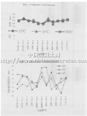 分別將水泥控制在25℃、50℃和70℃,比較不同水泥溫度對聚羧酸外加劑適應性。該組試驗選用冶建外加劑。
