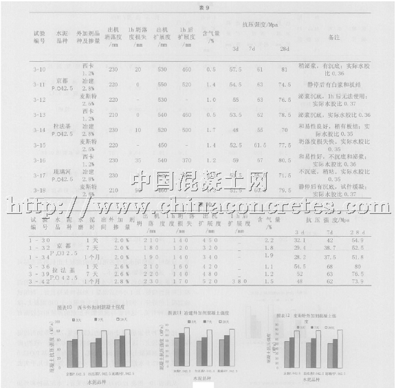 (3)水泥出磨時間對混凝土性能的影響針對拉法基P.O42.5 和京都P.O32.5 兩種水泥,在水泥剛出磨1 天和出磨后7 天、1 個月三種情況下,比較摻聚羧酸外加劑混凝土的性能變化。試驗均摻用冶建聚羧酸外加劑。有關試驗結果列于表10 中。