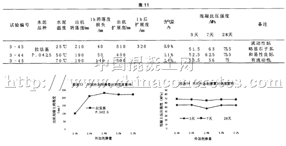 (4)水泥溫度對混凝土性能的影響表11 是興發拉法基P.O42.5 水泥和冶建聚羧酸外加劑( 摻量為2.8%),在25℃、50℃、70℃三種水泥溫度條件下,混凝土試驗的結果。
