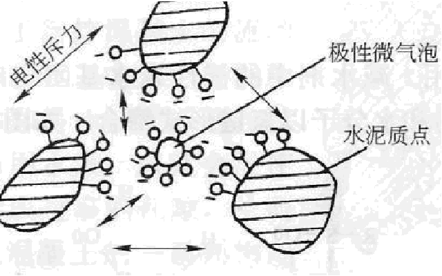 減水劑的加入,伴隨著引入一定量的微氣泡(即使是非引氣型的減水劑也會引入少量氣泡)。這些微細氣泡被減水劑定向吸附的分子膜所包圍,并與水泥質(zhì)點吸附膜帶有相同符號的電荷,因而氣泡與水泥顆粒間也因電性斥力而使水泥顆粒分散,如圖2.4所示,從而增加了水泥顆粒間的滑動能力(如滾珠軸承作用)。這種作用對摻加了引氣型減水劑的混凝土更為明顯。