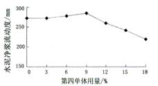 圖 2 第四單體用量對水泥凈漿流動度的影響 圖 3 第四單體用量對水泥凈漿泌水率的影響