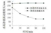 從圖 2 、圖 3 可以看出,第四單體用量為 9 %時,共聚物疏水基分子鏈增長適中,產物分散性較強,同時泌水性大大減輕。摻量太小時,產品雖有較強的分散性,但疏水基分子鏈增長不明顯,水泥凈漿泌水無明顯改觀;摻量過大時,泌水性小,但產物分散性下降,原因可能是分子支鏈長,但支鏈數量減少所致。 為了進一步驗證第四單體對產品性能影響,筆者又做了同等摻量下的水泥凈漿損失和混凝土泌水率對比試驗,試驗結果如圖 4 、圖 5 所示。