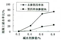 從圖 4 、圖 5 可以看出,摻加 9 %第四單體后的新型氨基系高效減水劑,水泥凈漿 120min 內基本無損失,而萘系高效減水劑 120min 損失很大 ; 混凝土對比試驗中,摻入第四單體后的新型氨基系高效減水劑,其混凝土泌水率也明顯低于傳統的三元聚合氨基系高效減水劑。