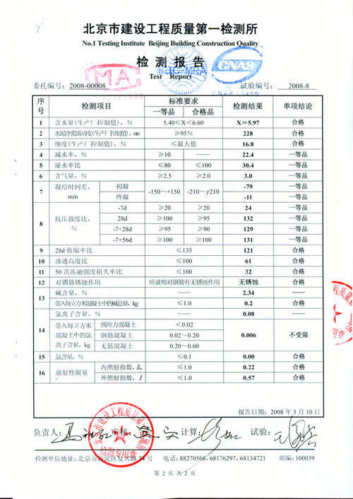 1 、對防凍劑要求 防凍害能力強;具有泵送性、早強;可配制高標號混凝土 ( 高減水率 ) ;低摻量、低造價;具有合格的供方條件;防凍劑為國家推薦產品。 由于我公司為魯班獎獲得單位,對使用產品要求較嚴格、經調研評審、最終決定使用北京慕湖外加劑廠生產的 MNC-C 10 型泵送防凍劑。