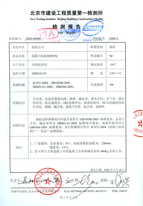生產廠應隨貨提供說明書和產品檢驗合格證。產品說明書包括:產品名稱、主要防凍組分及堿含量 (Na 2 O+0.658K 2 O) 、適用范圍、規(guī)定溫度、摻量、禁用場合、貯存條件、有效期、使用方法及注意事項。