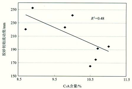 圖 7 熟料中 C 3A 含量與砂漿初始流動度的相關(guān)性