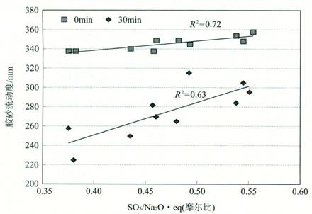 圖 8 熟料 SO 3 /Na 2 O · eq( 摩爾比 ) 與水泥砂漿流動度的關(guān)系