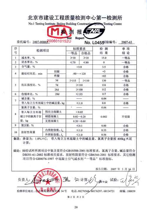 注:括號內數值為《建筑用卵石、碎石》 GB/T14685 中標準篩的尺寸。 | 5、檢驗摻引氣劑及引氣減水劑混凝土的含氣量,應在攪拌機出料口進行取樣,并應考慮混凝土在運輸和振搗過程中含氣量的損失。對含氣量有設計要求的混凝土,施工中應每間隔一定時間進行現場檢驗。 四、包裝、運輸、貯存及注意事項 用有塑料襯里的編織袋包裝,每袋凈含量25kg~40kg。搬運嚴禁用鉤;防止破袋發生。貯存注意防潮。貯存期為3年。嚴禁多摻或少摻。 五、重點工程應用實例 MNC-HAJ引氣高效減水劑在新疆庫爾勒農一師勝利水庫使用120噸。 MNC-AJ普通引氣減水劑在北京順義牛欄山奧運項目使用40噸。 引氣劑及引氣減水劑混凝土的含氣量,不宜超過表的規定;對抗凍融性要求高的混凝土,宜采用表規定的含氣量數值。