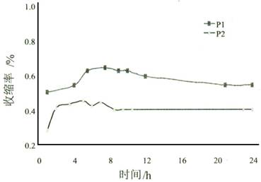 圖 3 摻 P1 、 P2 組分漿體 24h 自由收縮率隨時間的變化