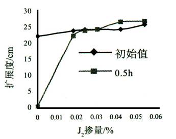 緩凝劑 J 2 是經過大量的試驗從多種緩凝劑中優選出來的,它能延緩灌漿料中組分的水化速度,從而可降低漿體的流動度損失率。其對擴展度影響實驗結果見圖 5 。