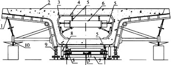 1-外側模板;2-混凝土構件;3-內模側板;4-內模頂板;5-液壓油缸; 6-內模支架;7-運輸小車;8-底臺;9-外模鉸接軸;10-螺旋千斤頂 |