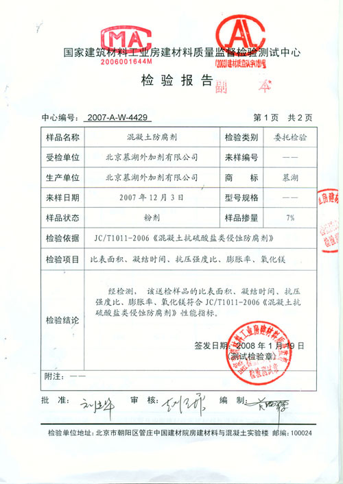6 . 3 . 1 出廠檢驗 每一編號抗硫酸鹽類侵蝕防腐劑檢驗項目包括氧化鎂、比表面積、凝結時間、抗壓強度比、膨脹率。 6 . 3 . 2 型式檢驗 型式檢驗項目為第 4 章全部性能指標。有下列情況之一時,應進行型式檢驗: a) 新產品試制定型鑒定; b) 正式生產后,如材料、工藝有較大改變,可能影響產品性能時; c) 正常生產時,每季度檢驗一次; d) 產品長期停產后,恢復生產時; e) 出廠檢驗結果與上次型式檢驗結果有較大差異時; f) 國家或地方質量監督檢驗機構提出檢驗要求時。