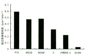 通過摻入不同的憎水劑,觀察 2min 和 1.5h 砂漿的表面水珠效果。可以看出 1.5h 后,摻 8034H 砂漿表面水珠效果最好, B1490 其次。按照 1 . 3 . 1 方法 2 ,測(cè)定了抹面砂漿的吸水量,計(jì)算濕遷移滲透系數(shù),結(jié)果如圖 3 。可以發(fā)現(xiàn),摻入不同憎水劑的抹面砂漿, B1490 濕遷移滲透系數(shù)最小,增水效果最好。