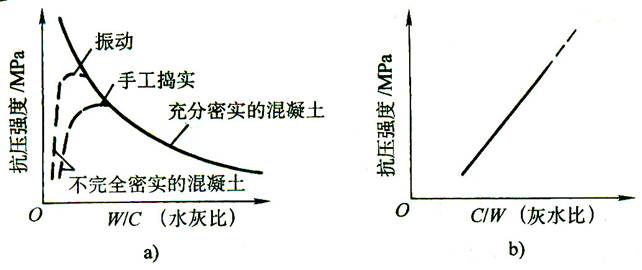 a) 強度與水灰比的關(guān)系 b) 強度與灰水比的關(guān)系