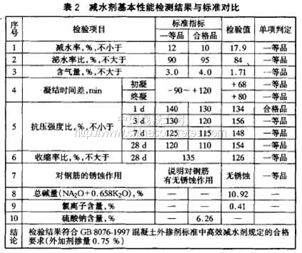 采用邯鄲產(chǎn)CF-88高效減水劑(粉料),屬蔡系減水劑,基本性能檢測(cè)結(jié)果與標(biāo)準(zhǔn)對(duì)比見表2.