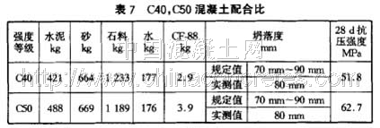 2.1 C40,C5 0混凝土配合比(每耐水泥混凝土各種材料用量及試驗(yàn)結(jié)果)見表7