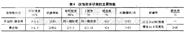 (1)對用于承受沖擊、振動、疲勞動載的地上和地下的公路工程的防水砂漿以及受腐蝕和凍融循環的公路砌體結構中的防水砂漿,首推聚合物改性水泥防水砂漿。其性能應符合表9的規定,配合比可參考表10,