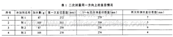 對此 ,我們通過長期的試驗,發現在試驗過程中測其第一個直徑時與測第二個垂直的直徑時,時間間隔大概有3-4s。對于高減水率、大流動度的凈漿而言,30s后仍具有一定的流動性,還會繼續擴展,經過3-4s的時間間隔,流動度值就增大。因此,我們對二種高效外加劑不同的用水量在一方向上測得的直徑,經3-4s再次測其同一方向的直徑,所得數據如表1所示。