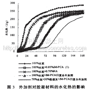 水泥)的水化熱進(jìn)行了測試,結(jié)果列于圖3中。從試驗(yàn)結(jié)果來看,JM-PCA(I)能明顯延緩水泥的水化放熱,其效果優(yōu)于NA,同時(shí)JM-PCA(I)能-定程度的降低水泥7d水化熱值。另外,在70%水泥+30%粉煤灰的膠凝材料體系中,JM-PCA(工)延緩水泥的水化放熱和降低7d水化熱值的作用更為明顯。摻復(fù)合外加劑后,膠凝材料的水化放熱值均進(jìn)-步降低,復(fù)合外加劑能明顯延緩膠凝材料的水化放熱。在70%水泥+30%粉煤灰的膠凝材料體系中,復(fù)合外加劑對延緩水泥的水化放熱和降低7d水化熱值的作用更為明顯。