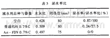 4.2 本文在萘系減水劑的基礎上研制的Act-FDN,不溶于水但溶于堿,具有反應性的特征,在堿性環境中可以分解釋放出具有分散性能的陰離子磺酸基,從而達到了降低坍落度損失的目的。因為Act - FDN并沒有復合緩凝組分,不同于一般的保塑劑或復合型減水劑,突出的優點就是對混凝土早期強度無不利影響。