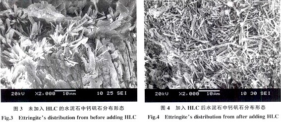 與基準混凝土相比,加入HLC型外加劑的混凝土膨脹率發展較為穩定,后期落差小,究其原因可發現,由于膨脹組份水化形成大量鈣礬石,形成的較大體積的膨脹使得混凝土的收縮得到了較大程度的補償,如圖2—圖4所示。