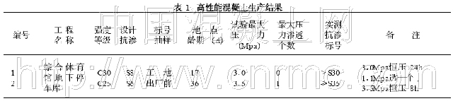 由廈門市路橋混凝土有限公司提供預拌混凝土, 集美大學綜合體育館地下停車庫梁、板(105m ×30m ×0.4m) 兩塊約2600m3 , 采用的混凝土, 設計標號為C30 S8, 泵送施工, 坍落度12cm。用福建水泥股份有限公司煉石P.O42.5; 比表面積388m2 /kg; 0.08mm的篩余0.24% , 初凝時間2h; 終凝時間3h; 3d抗壓強度32.0MPa; 3d抗折強度5.7MPa; 28d抗壓強度57.5MPa;28d抗折強度8.7MPa。中砂(Mx = 2.7) , 碎石( 5 - 40mm) , 連續級配, 內摻Ⅱ級粉煤灰60kg/m3, 摻用淘正化工生產的超塑化劑CS-SX1水泥重量的1.1%, 水灰比為0.45, 出機SL = 14~15cm, 現場施工SL = 11~14CM。可泵性與保水性良好, 實際混凝土強度28天為37.6~41.0Mpa, 抗滲S > 30時(未發現滲透) 。生產結果(見表1) ,