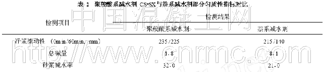 (1) 保坍性, 由于工程使用的水泥0.08mm的篩余僅為0.24% , 細度很小, 另外使用的砂偏細,所以勢必增加了對外加劑的吸附, 從而加大了提高混凝土保塑性的難度;