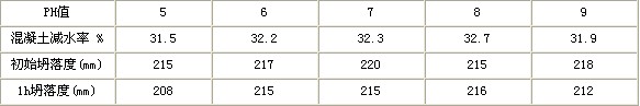 從上表可以看出,PH值的變化對混凝土的減水率和保坍性能沒有明顯的影響。