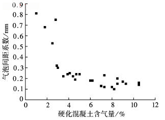 圖2 硬化混凝土含氣量與氣泡間距系數關系曲線