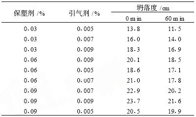 0.005%、保塑劑用量為0.06%時,混凝土初始坍落度為18.6 cm,1 h坍落度保留值為17.1 cm。因此,合理摻用引氣劑和保塑劑,既可優化混凝土性能,又可節省外加劑應用成本。