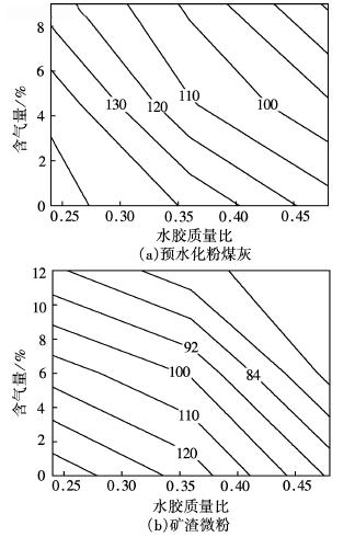 圖3 摻聚羧酸類引氣劑及礦物外摻料的混凝土28 d抗壓強度百分比等高線