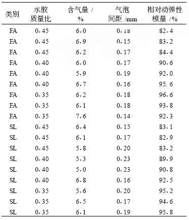 凝土含氣量大于等于4%時,氣泡間距小于等于0.2 mm,這一試驗結果優于常用非聚羧酸類引氣劑。但對同一組混凝土而言,硬化混凝土比塑性混凝土氣泡間距系數略大,因為混凝土含氣量不僅在塑性狀態存在經時損失,而且在成型時尺度較大的氣泡將消失。